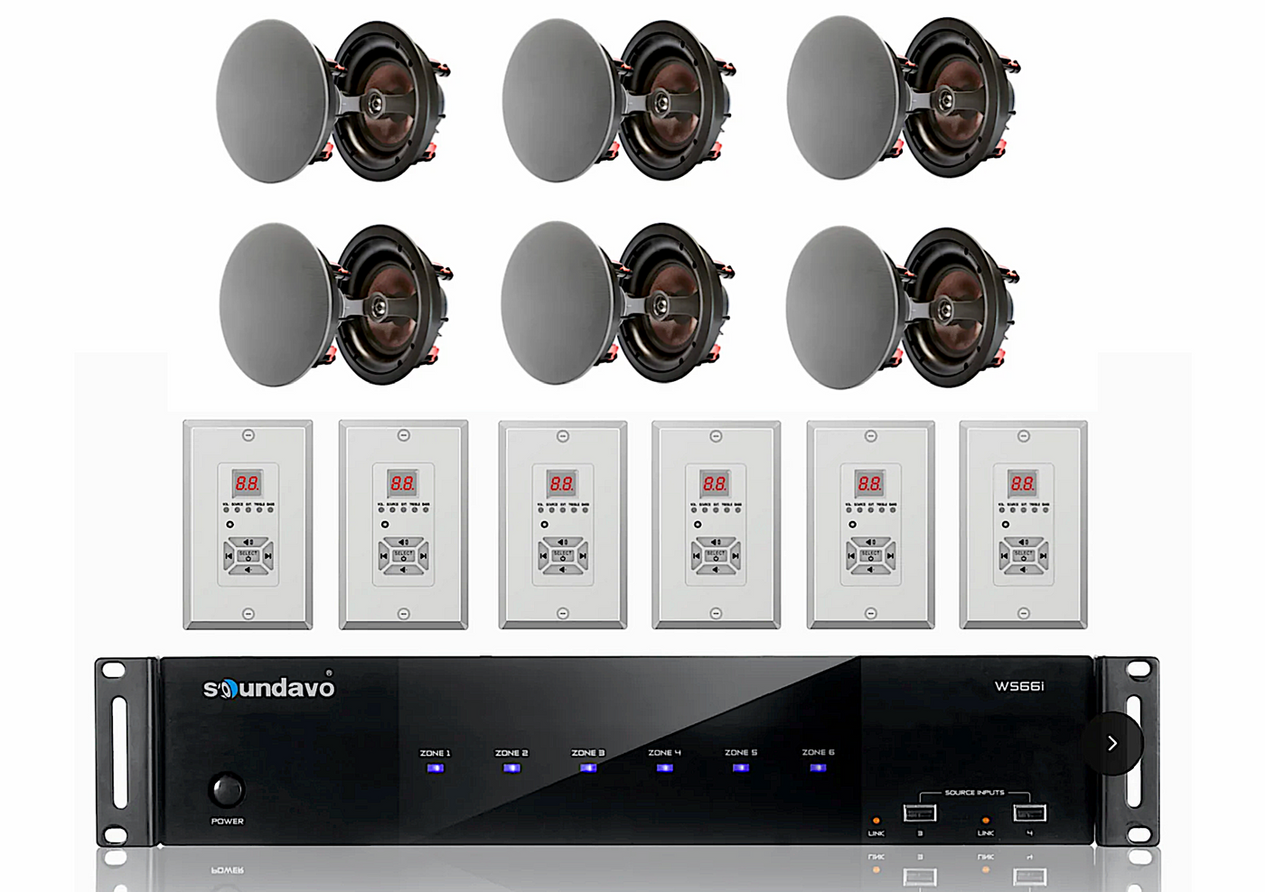The Soundavo "WS66i-KIT-IC860CF-Pack" Whole-Home Audio System Set includes 1 x WS66i (KIT Package) Distribution Network Controller Matrix Amplifier & 6 Pairs of  IC-860CF In-Ceiling 8" Speakers.
